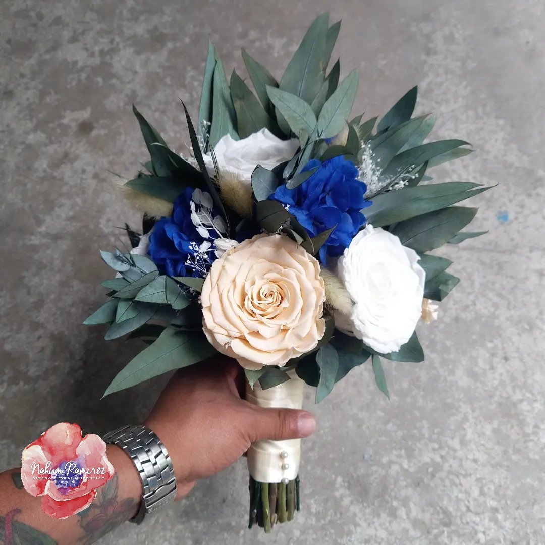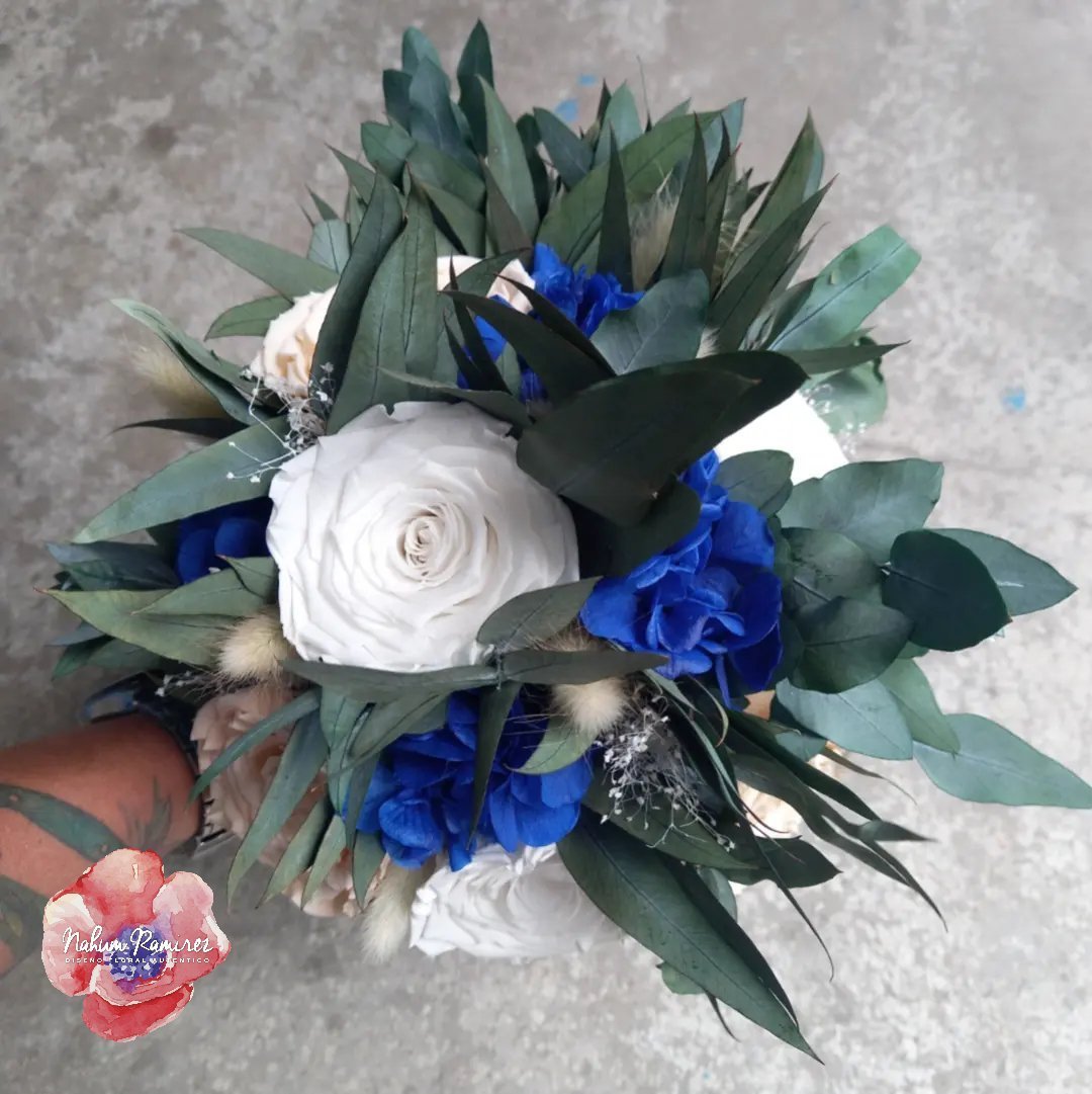 Ramo de novia rehidratado en blanco, ivory y azul. Envíos a toda la República.