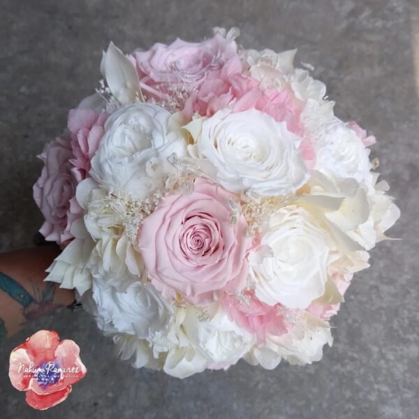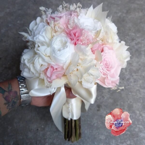 Ramo de novia preservado en tonos blancos y rosas. Incluye bottoniere del novio. Enviamos a toda la República. Cotízalo con envío.