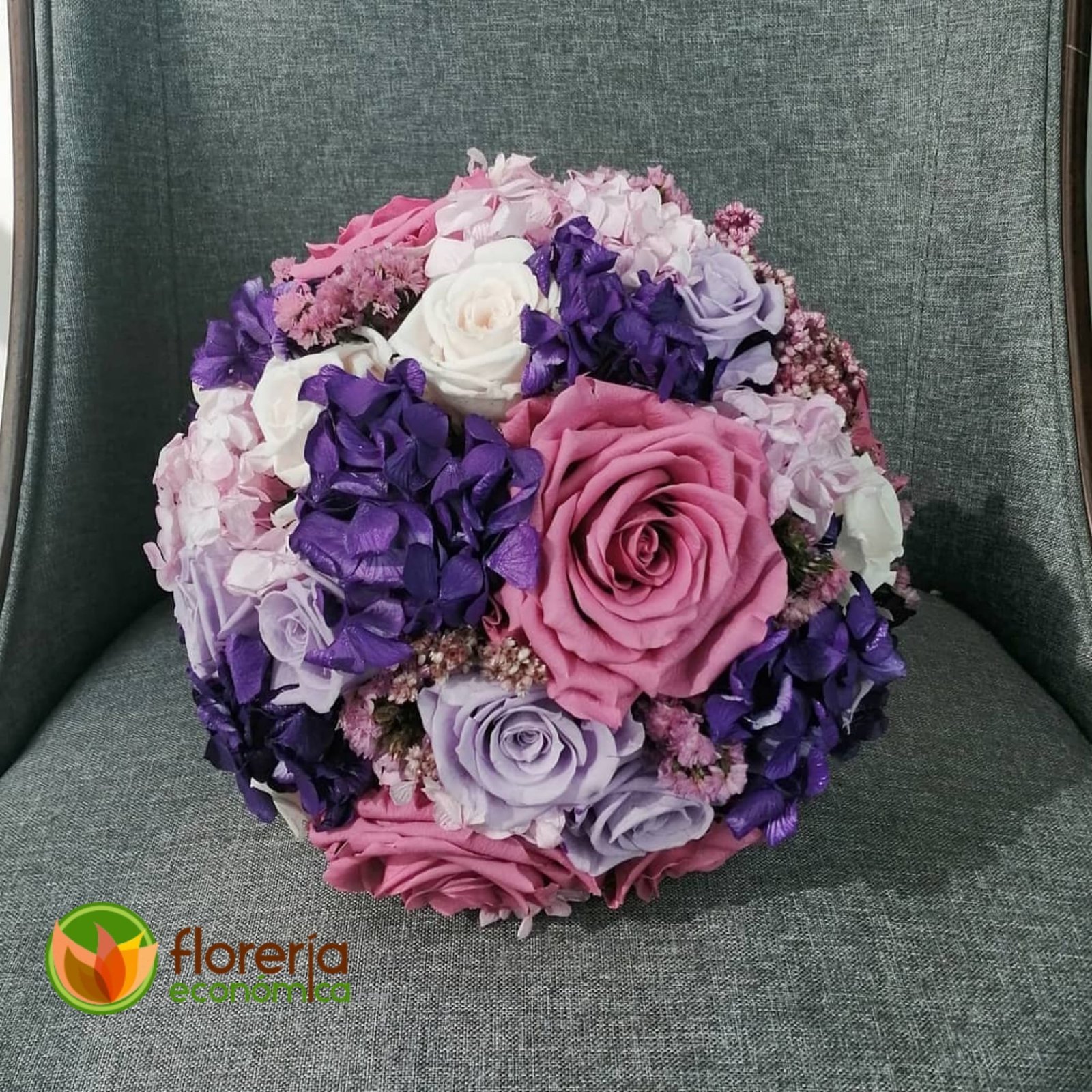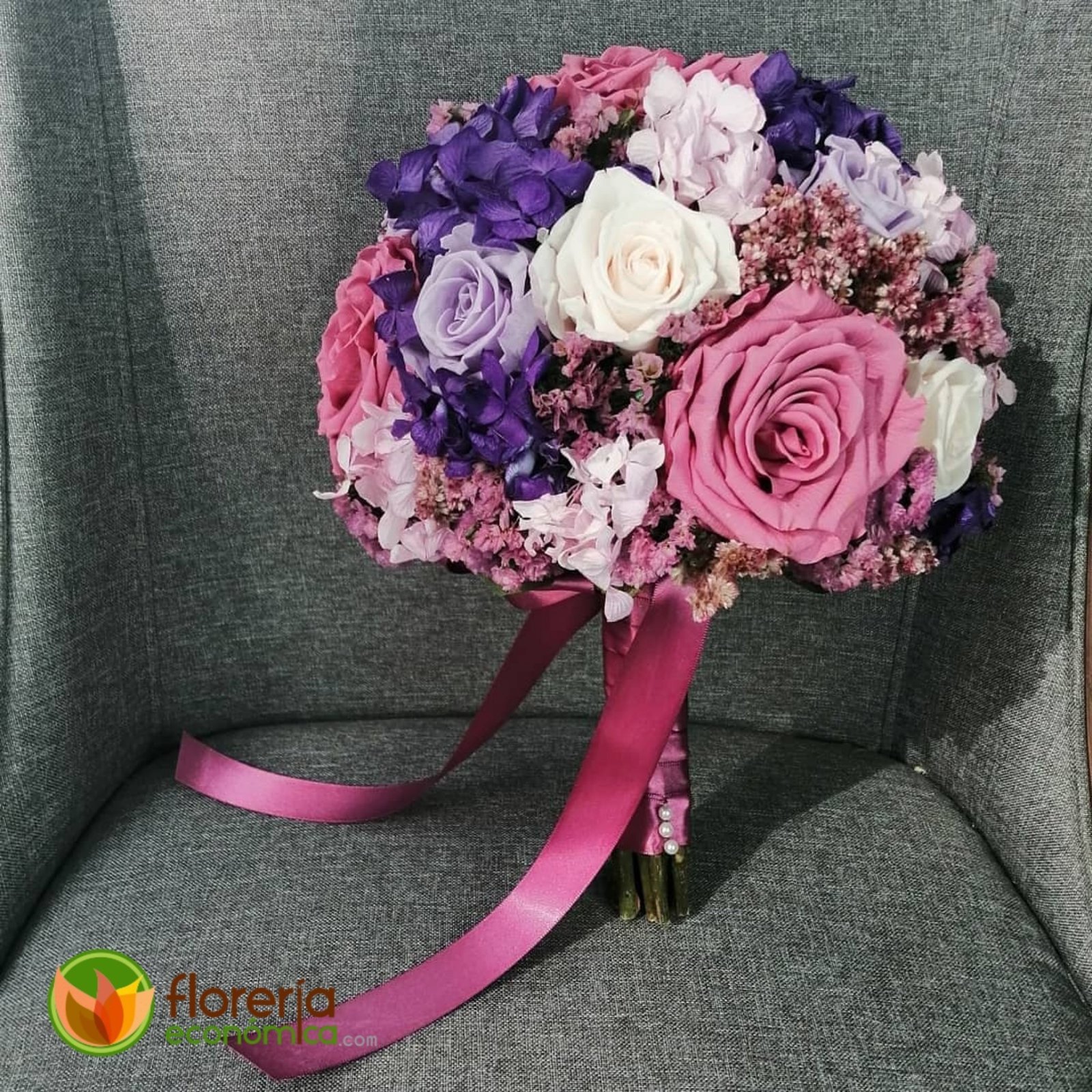 Ramo de novia rehidratado lila y morado con rosas, hortensias y follaje a tono. NO INCLUYE EL COSTO DEL ENVIO. Enviamos a CDMX y Estado de México.