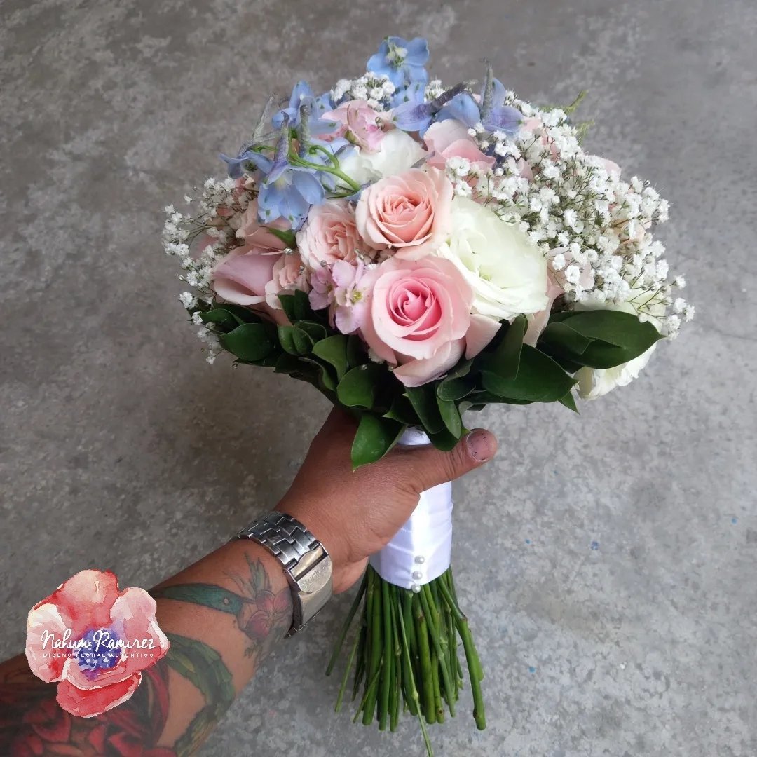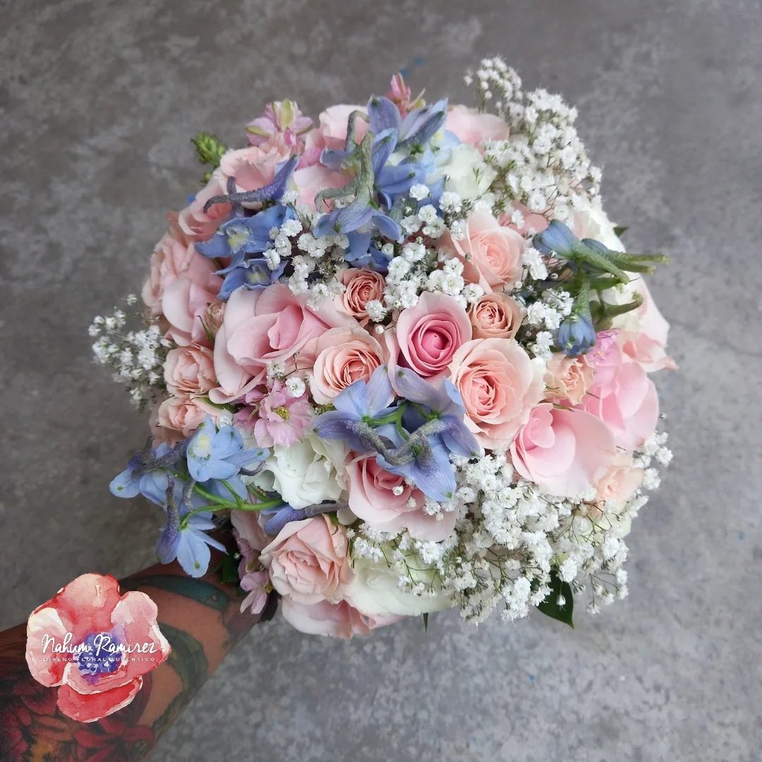 Ramo de novia en rosas rosas, baby breath y toques de azul. Arman tu paquete con el de aventar y el ramo de la virgen.