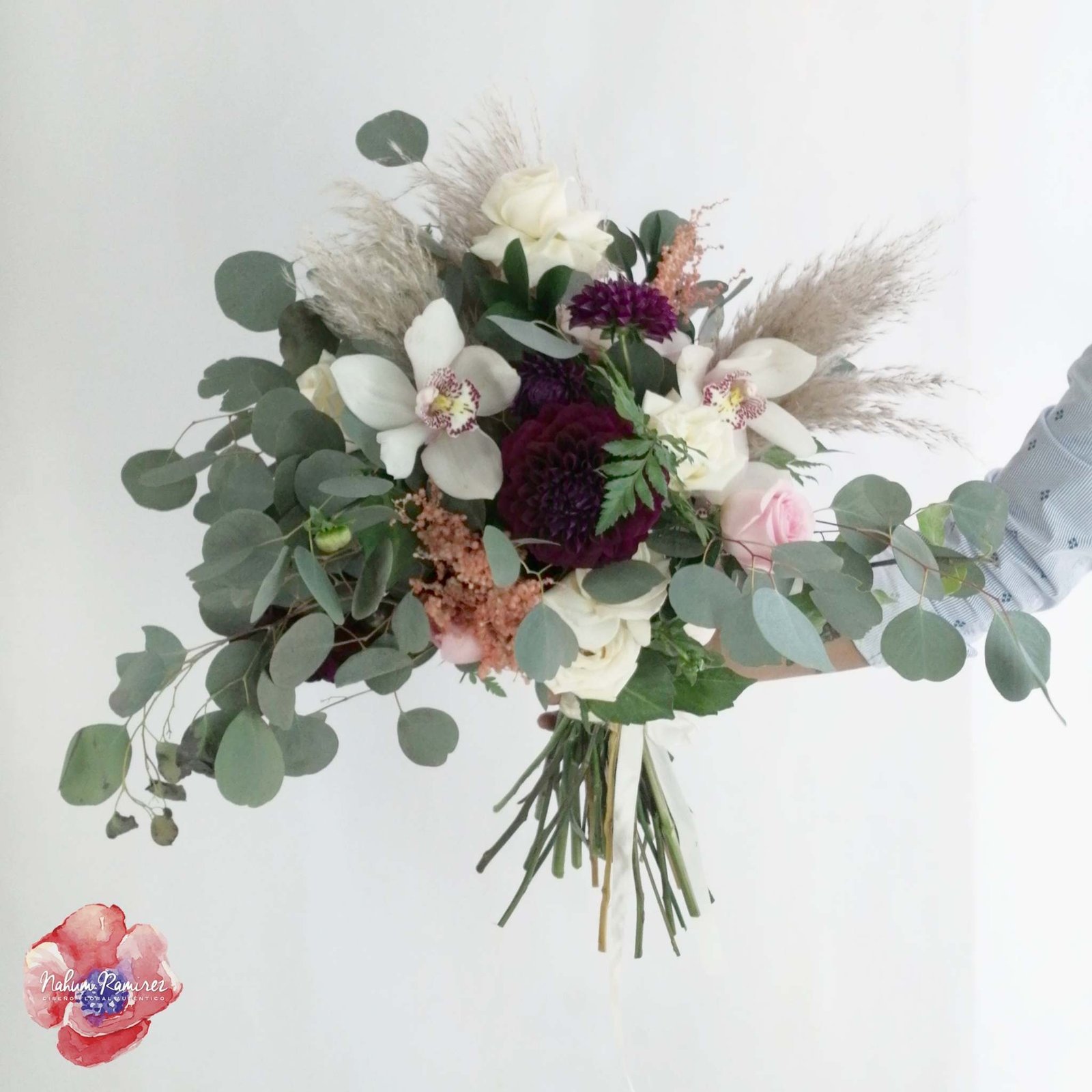 Ramo de novia tendencias, natural y silvestre, con rosas en dos tonos, orquídeas cymbidium blancas, dahlias y follajes varios. Te lo entregamos en CDMX y Área Metropolitana en la puerta de tu casa el día de tu boda con envío a domicilio.