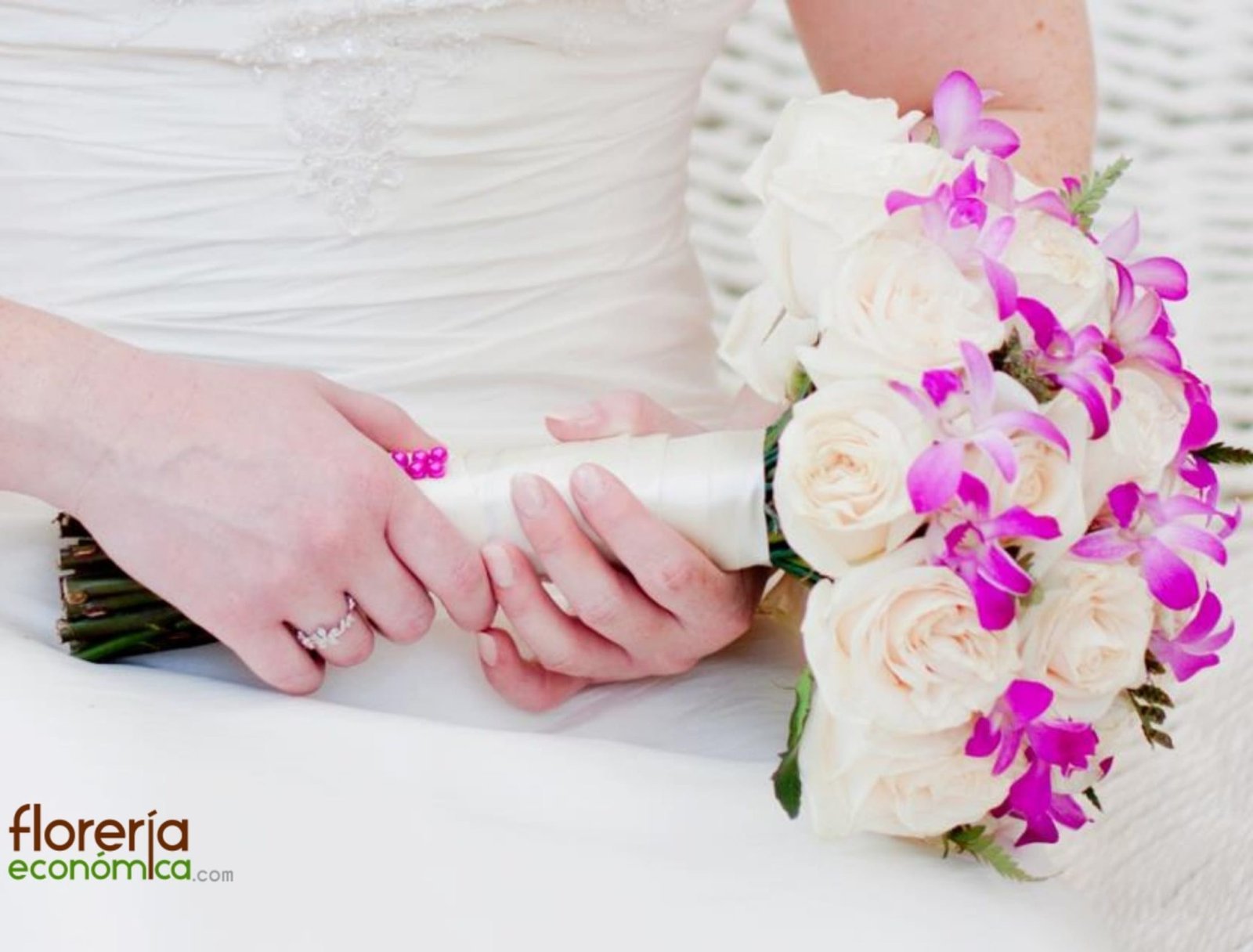 Ramo de novia con orquídeas dendrobium color fucsia y rosas color ivory. Lo envíamos a tu casa con costo adicional de envío.