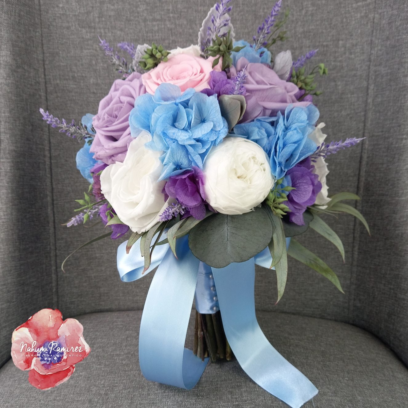 Hermoso ramo rehidratado en azul, lila y blanco. Está hecho con rosa estandar, rosa inglesa y hortensias en dos tonos. Hacemos envíos a toda la República